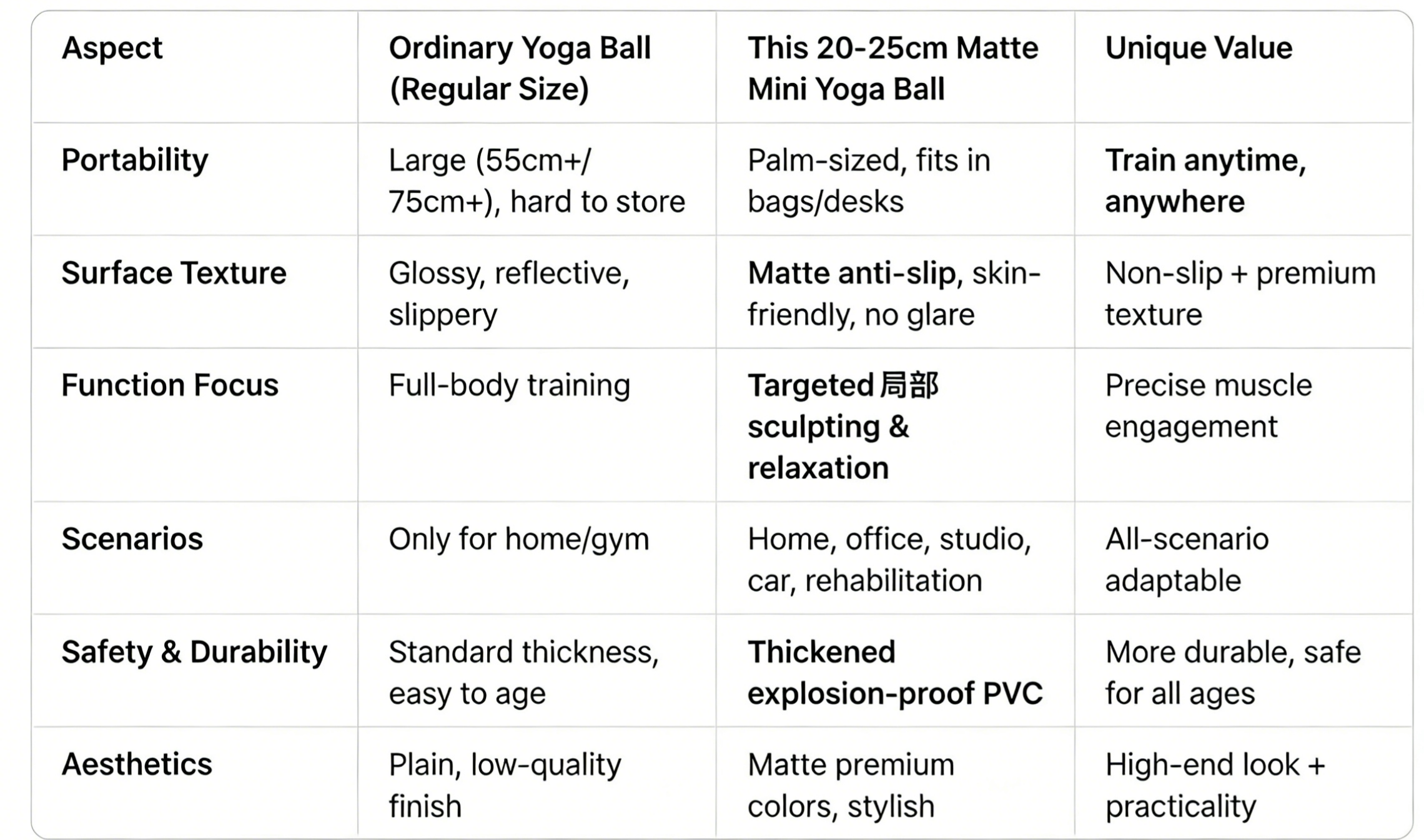 Unlike the rough full-body training with large yoga balls, the 20cm mini size fits perfectly with your waist, abdomen, pelvic floor, shoulders, neck, and thighs. It precisely targets deep core muscles, pelvic floor muscles, and stiff shoulder-neck points, improving posture, aiding postnatal recovery, and relieving muscle soreness more effectively and delicately than large balls.