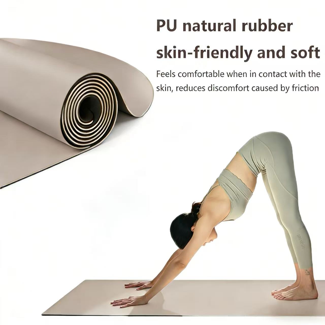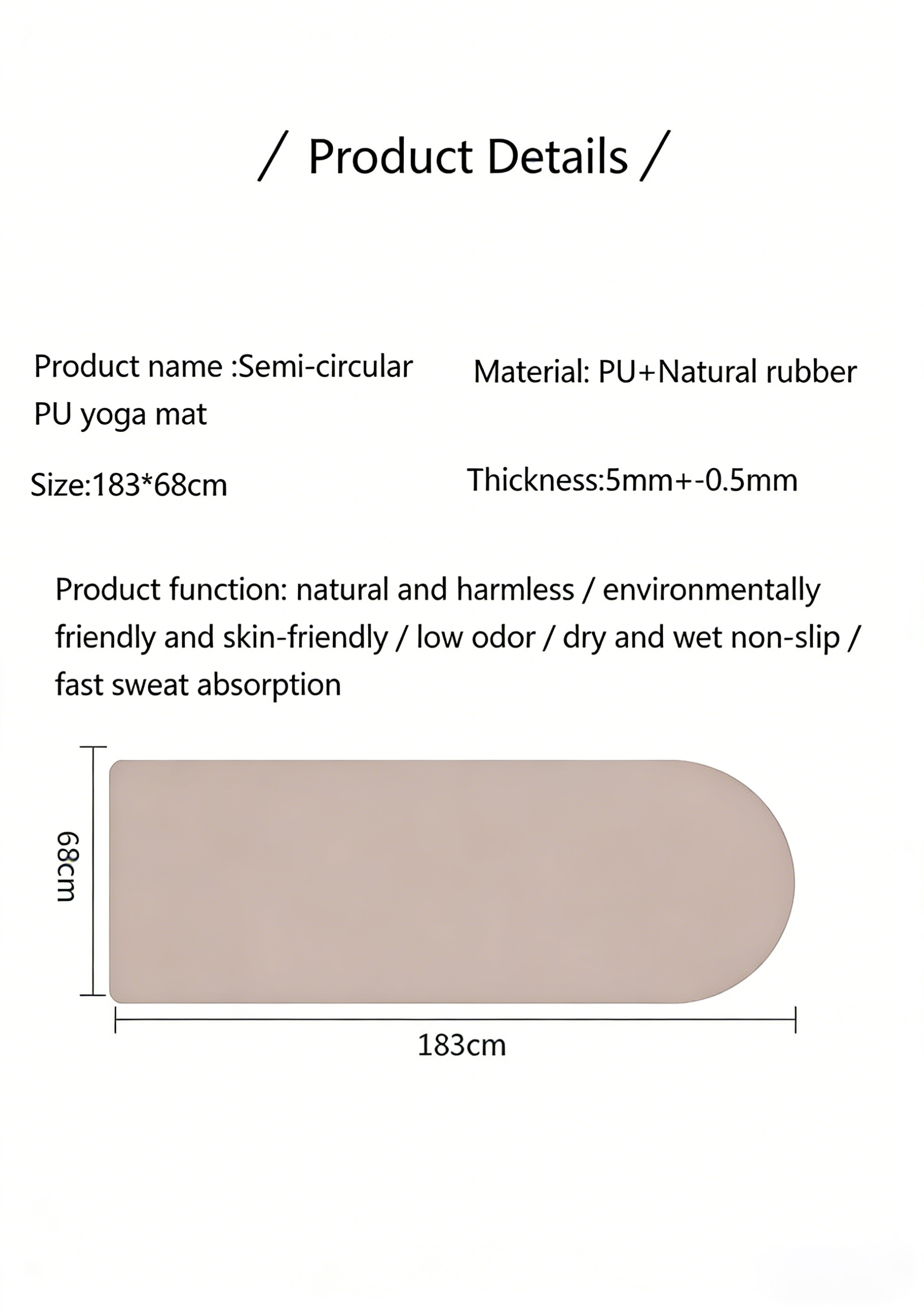 3、Superior Wet & Dry Non-Slip Grip: Stay Secure, Even When Sweaty The secret to our mat’s performance lies in its patented surface technology. • Dry Grip: The PU leather top layer offers a tactile, non-slip surface that enhances your grip during standing poses, balances, and arm balances. • Wet Grip (Sweat-Absorbent): As you sweat, the mat’s high-quality PU material actively absorbs moisture, preventing your hands and feet from sliding. This makes it ideal for Hot Yoga, Power Yoga, and Vinyasa flows—where a secure grip is non-negotiable. • Long-Lasting Traction: Unlike PVC mats that become slippery over time, our PU mat’s grip improves with use, becoming more responsive to your movement. 4. 🧘♀️ Ergonomic Semi-Circular Design: Body-Hugging Support Our unique semi-circular (half-moon) shape is more than just aesthetic—it’s designed for functionality. • Body Alignment: The curved edge provides ergonomic support for the hips, spine, and legs, aiding in proper posture during seated and lying poses.